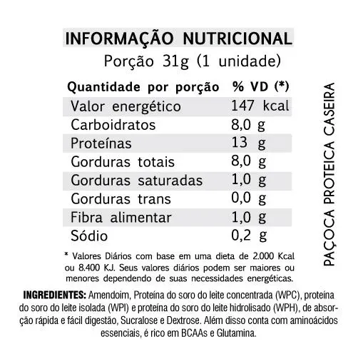 Alta Proteína: Com a adição de proteína de soro de leite, a nossa paçoca é uma fonte rica em proteínas, fundamental para o crescimento e reparação dos músculos.